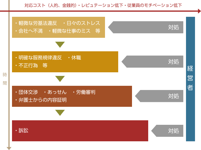 逆に労働問題は長期化すればするほど企業に対して多額のコストと時間・関係者の労力といった有形無形の損害をもたらします。